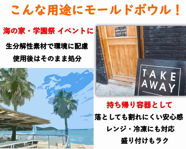 紙素材の主原料は木を使用していますが、モールド容器はサトウキビの「絞りかす」を使用。素材を無駄なく使う事に竹の皮と似た理念を感じ、販売を開始しました!!